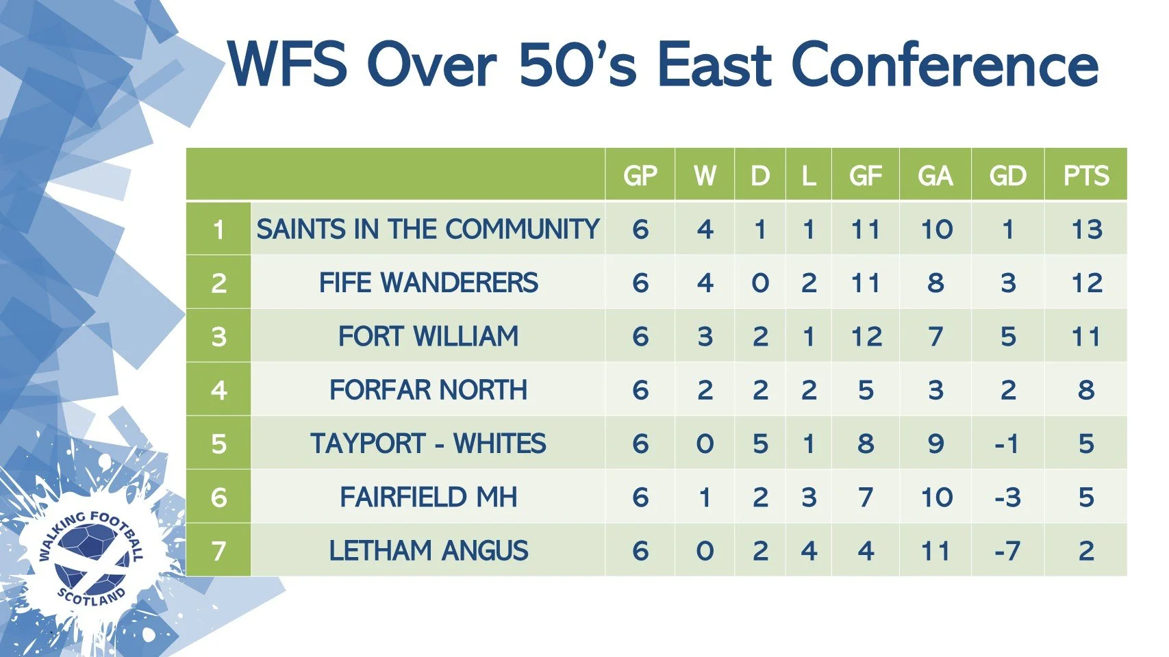 The Conference is the tightest race of them all — just two points separate first from third. Saints in the Community currently lead the way, but second-placed Fife Wanderers meet third-placed Fort William in a match that could completely rewrite the leaderboard by day’s end.